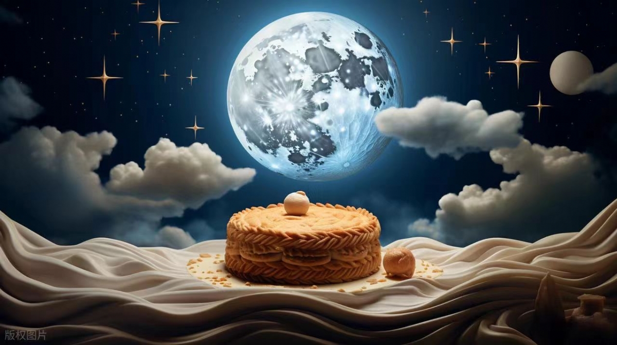 月亮湖上,一艘木船静静漂流。船头坐着一位戴斗笠的老者,双手稳握船桨;船中央,一个孩童紧紧抱着一篮红得发亮的苹果。两人之间,立着两只银光闪闪的兔子雕像,雕像旁散落着月饼和各色水果。