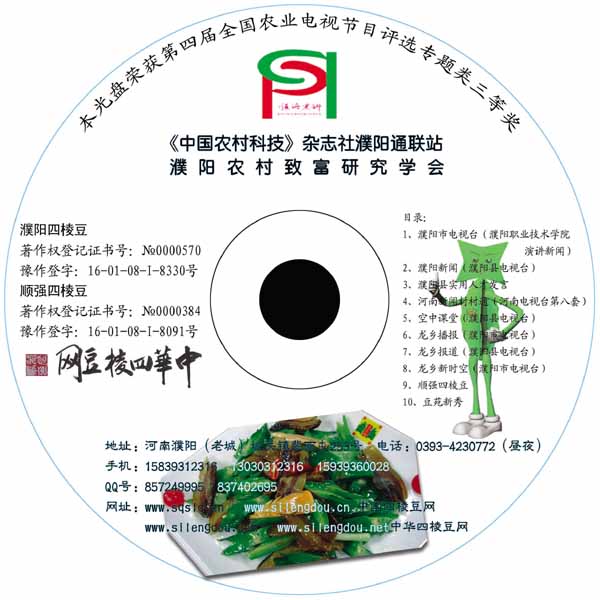 把这整一个产品介绍本产品获得全国第四届农业电视专题节目三等奖,濮阳四棱豆版权号是豫作登记字16-01-08-I-8330    顺强四棱豆著作权登记证号豫作登字16-01-08-I-8091号每张光盘50元整