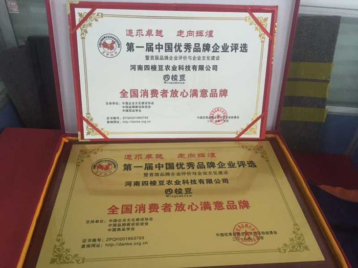 四棱豆被授予中国农业行业AAA信用企业和“全国消费者放心满意品牌”