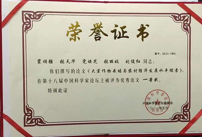 财政部原部长刘仲藜,中国科学院院士、国家自然科学基金委员会原主任陈佳洱icon,十二届全国政协教科文卫体委员会副主任张秋俭,十二届全国政协人口资源环境委员会副主任、中国科协icon原副主席齐让,十一届全国人大外事委员会副主任委员马文普,十二届全国政协社会和法制委员会副主任张世平,十二届全国人大教科文卫委员会副主任委员王佐书,国际欧亚科学院院士、科技部原副部长刘燕华,国务院国有重点大型企业监事会原主席、中国科学技术法学会名誉会长段瑞春,原建设部副部长邹玉川,国际欧亚科学院院士、科技部原秘书长、党组成员张景安,中国工程院院士、中国工程院原副院长杜祥琬,中国工程院院士、中国工程院原副院长樊代明icon,中国工程院院士、清华大学自动化系教授吴澄,中国管理科学研究院副院长兼秘书长于国厚,中国科学家论坛主席、中国管理科学研究院商学院院长陈贵,著名心血管专家、原卫生部首席健康教育专家洪昭光,中国技术市场协会会长陶元兴,中国未来研究会副理事长兼秘书长、 中国高科技产业化研究会秘书长黎宇虹,中国技术市场协会副会长武毅,中国文化管理协会城市文化委员会会长马克等领导专家出席的相关学术交流活动。裴顺强,张天华,党焕芝,张丽姣,刘俊红撰写研究《大宗作物栽培与农村经济发展水平探索》论文成果在第十八届中国科学家论坛上被评为优秀论文一等奖。