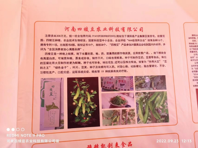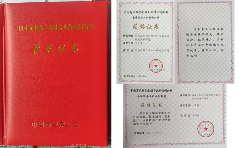 《四棱豆知识产权保护与农业栽培发展新形势》从四棱豆专利,版权登记,商标,四棱豆栽培学术学术创新创新方面2021年向中国商业联合会提交申报的。河南四棱豆农业科技有限公司和企业法人裴顺强农业专家获得全国服务业科技创新三等奖,这次获奖是由中国商业联合会服务业奖励办公室【中国商业联合会科技质量工作委员会】主办。“中国商业联合会科学技术奖,”是经国家科技部、国家科学技术奖励工作办公室批准设立的奖项。该奖项旨在表彰在全国商业行业科学技术研究创新,成果推广。高新技术产业化中做出突出贡献的单位和个人,以此推动商业行业科技进步。中国商业联合会作为国家科学技术奖的提名单位,每年将从获得全国商业科技进步奖特等奖等项目中,择优提名国家科学技术奖评审。该奖项此前全国著名的大专院校的学者、大企业作为实力层次及职称晋级主要科技成果及品牌背书核心依据和宣传资本。此前河南大学,郑州大学,河南科技大学,郑州黄河职业技术学院及教授获得过此奖项!