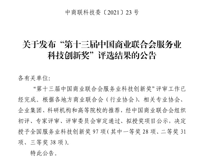 关于发布“第十三届中国商业联合会服务业科技创新奖”评选结果的公告 各有关单位:“第十三届中国商业联合会服务业科技创新奖”评审工作已经完成。根据各地方商业联合会(行业协会)、相关专业协会、企业集团、科研机构和高等院校的推荐,经中国商业联合会组织初评、专家评审、评审委员会审定通过、拟授奖项目公示,决定授予全国服务业科技创新奖97项(其中一等奖28项、二等奖31项、三等奖38项)。特此公告。第27项四棱豆知识产权保护与农业栽培发展新形势【河南四棱豆农业科技有限公司】裴顺强获得三等奖。这是公司成立以来,第一次获得的国家级商业口创新创业大奖,在这之前中国农业大学,海河大学,河南大学,河南科技大学,河南工业大学,黄河职业技术学院多次获得类似奖项。