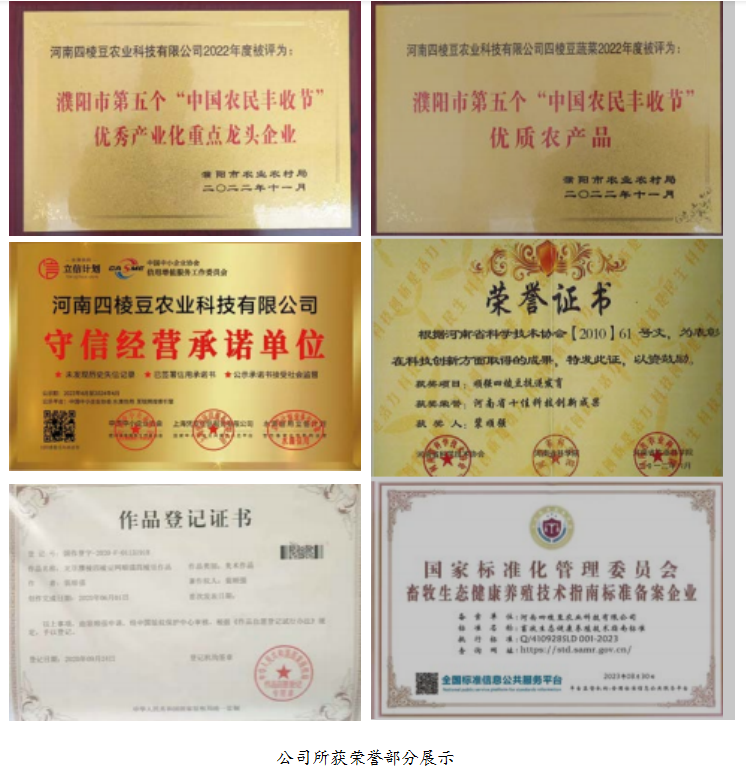 2018 年第一届中国优秀品牌企业评选暨首届品牌企业评价与企业文化建 设,河南四棱豆农业科技有限公司被评为“中国农业行业 AAA 信用企业”荣誉 称号, “四棱豆”被评为“全国消费者放心满意品牌”。《四棱豆顺强 008 育 种技术》《顺强四棱豆抗逆发育》这两项成果 2021 年被河南省科学技术协会、 河南省科学院、河南省农业科学院评为河南省十佳科学技术成果;2021 年底 重质量守信誉示范单位,企业评级 AAA 级信用企业。《四棱豆生物栽培与饲料 经济分析(栽培改良)》科技成果一等奖。2022 年企业和个人获得中国商业 联合会服务业科技创新奖三等奖;自 1988 年 7 月从濮阳县职业技术学校毕业 后从事农业试验 33 年演变过程,获得专利 11 项,商标证书 38 项,版权证书 15 项,网络域名 33 项。