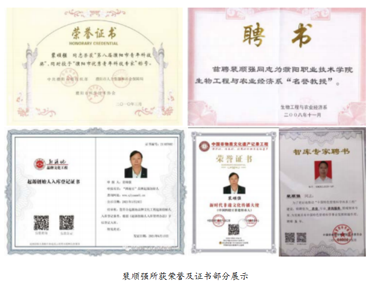 裴顺强艰苦奋斗远近闻名,也使他获得了更多的工作和荣誉。1993 年 7 月,他被《诚达信息》聘为编辑记者,1995 年被《中国农村科技》杂志评为 国家级优秀通讯员,当年又被聘为濮阳通联站站长。1997 年被中国农学会吸 纳为会员, 2003 年被中共濮阳县委组织部、县科协评为“科普示范带头人”。 2004 年底被河南省评为“高级技师”。2006 年 12 月被聘为“第五届中国农经